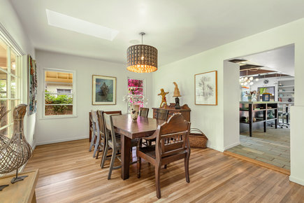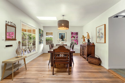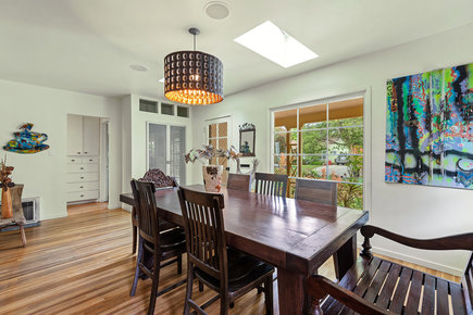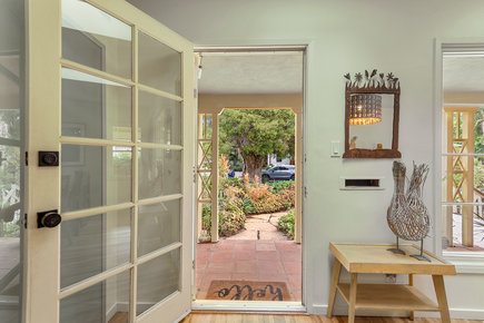 Charming Oasis on a Tranquil Melaleuca Tree-Lined Street in Mar Vista’s Coveted Wood Streets. Tucked away on a beautifully landscaped 5,280 sq ft lot, this enchanting 2-bedroom, 1-bathroom home combines timeless charm with modern amenities and an effortless indoor/outdoor flow. This private retreat is bathed in natural light, thanks to skylights and large windows throughout. Step inside to find original built-ins, gorgeous wood and Chinese slate floors, and a welcoming great room with striking structural beams and a cozy gas fireplace. The expansive chef’s kitchen is a true standout, featuring Corian and soapstone countertops, a breakfast bar, and seamless connection to the open dining area that glows with natural light. Almost every room opens directly to the lush, ultra-private backyard making it your own personal sanctuary complete with a sun-soaked deck, outdoor shower, and vibrant landscaping including banana and avocado trees, bougainvillea, and drought-resistant succulents. An additional gas fireplace on the deck makes this an entertainer’s dream year-round. Both bedrooms are generously sized and share an updated spa-like bathroom with a stunning floor-to-ceiling window that overlooks a bamboo tree perfect for a tranquil experience. The home also includes a carport, dedicated laundry area, and an irrigation system. All this, located just minutes from shops, restaurants, and everything Westside LA has to offer.